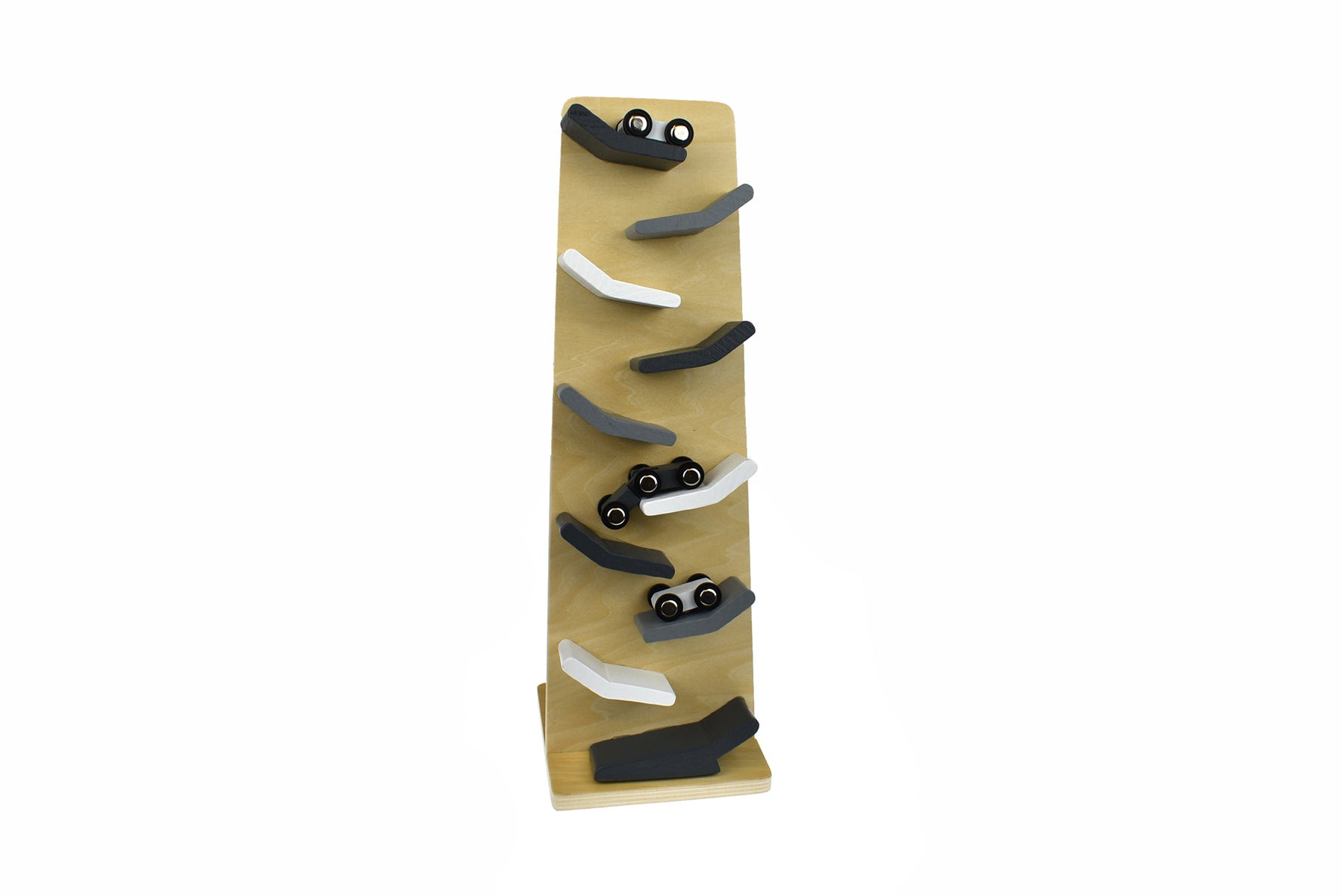 Race your cars down the rolling wooden track. Cars flip and roll down the track and are a joy to watch as they tumble down, making a gentle clicking sound as they roll. This rolling car tower comes with two standard cars and one double-length hinged car.