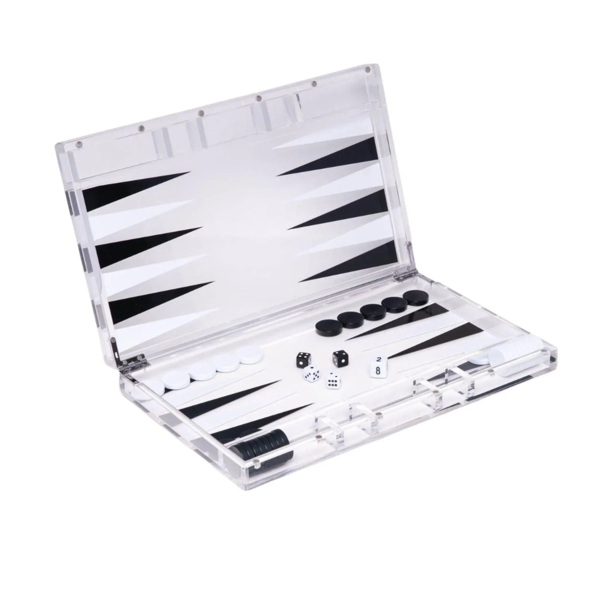 This lucite backgammon set brings a modern twist to a classic game of backgammon. Its magnetic closure and discreet hinges provide for a sleek and minimal design, perfect for any living room, game room, office, or man cave - a sure conversation starter!