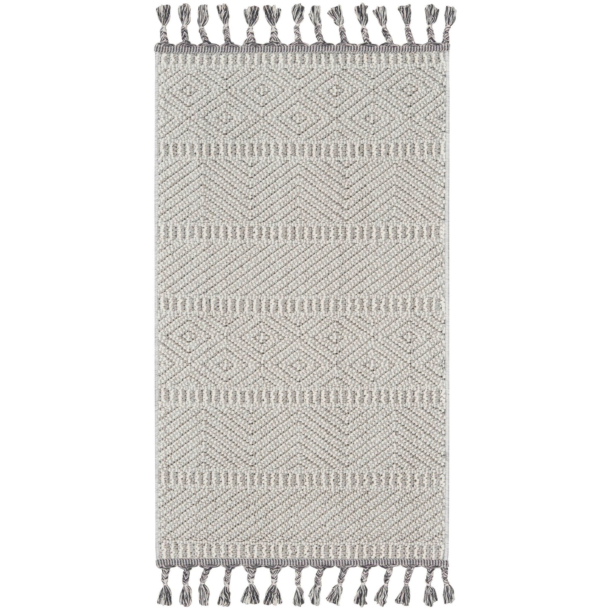 Lend amazing depth, movement, and interest to a room with this wonderfully versatile rug. Its modern geometric patterns are grounded in symmetry perfect for contemporary to casual living spaces. Crafted in durable and soft polypropylene with a textured loop pile this beautiful rug has fringe ends and neutral tones to make it a welcome guest in any space.