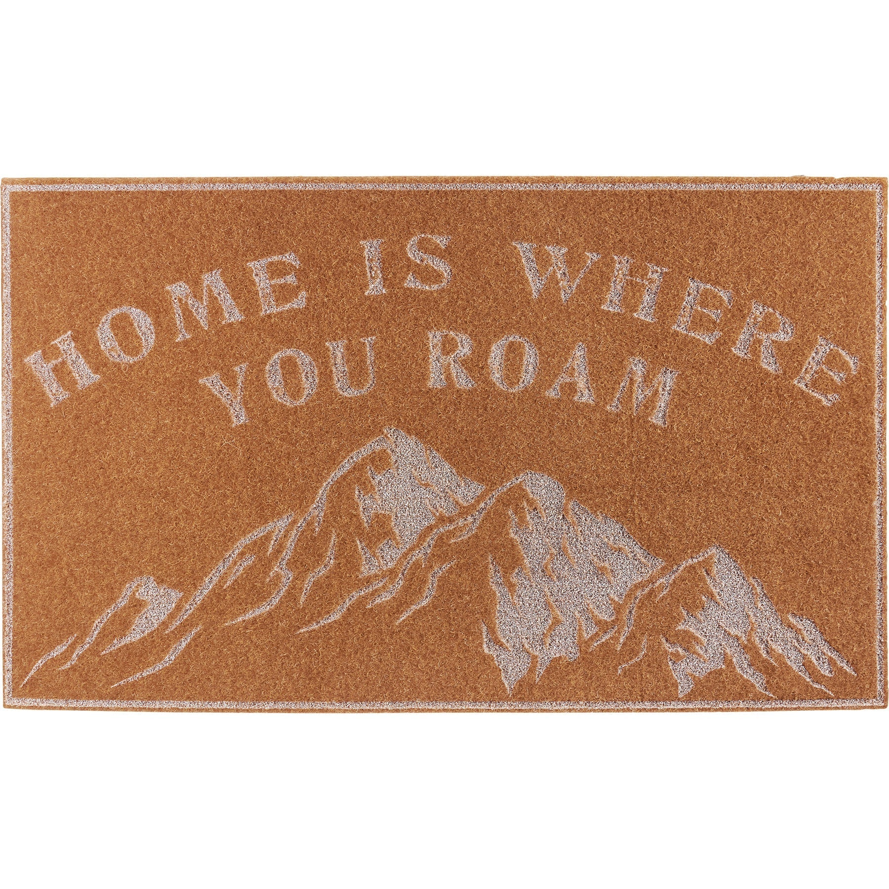 A durable faux coir rug displaying an engraved mountain design and "Home Is Where You Roam" sentiment on plain coir background. Faux coir offers the benefit of not shedding over time, unlike natural coir rugs, so the integrity of the design and colors will last longer. Rug can be used indoor or outdoor and features skid-resistant backing to help stay in place.