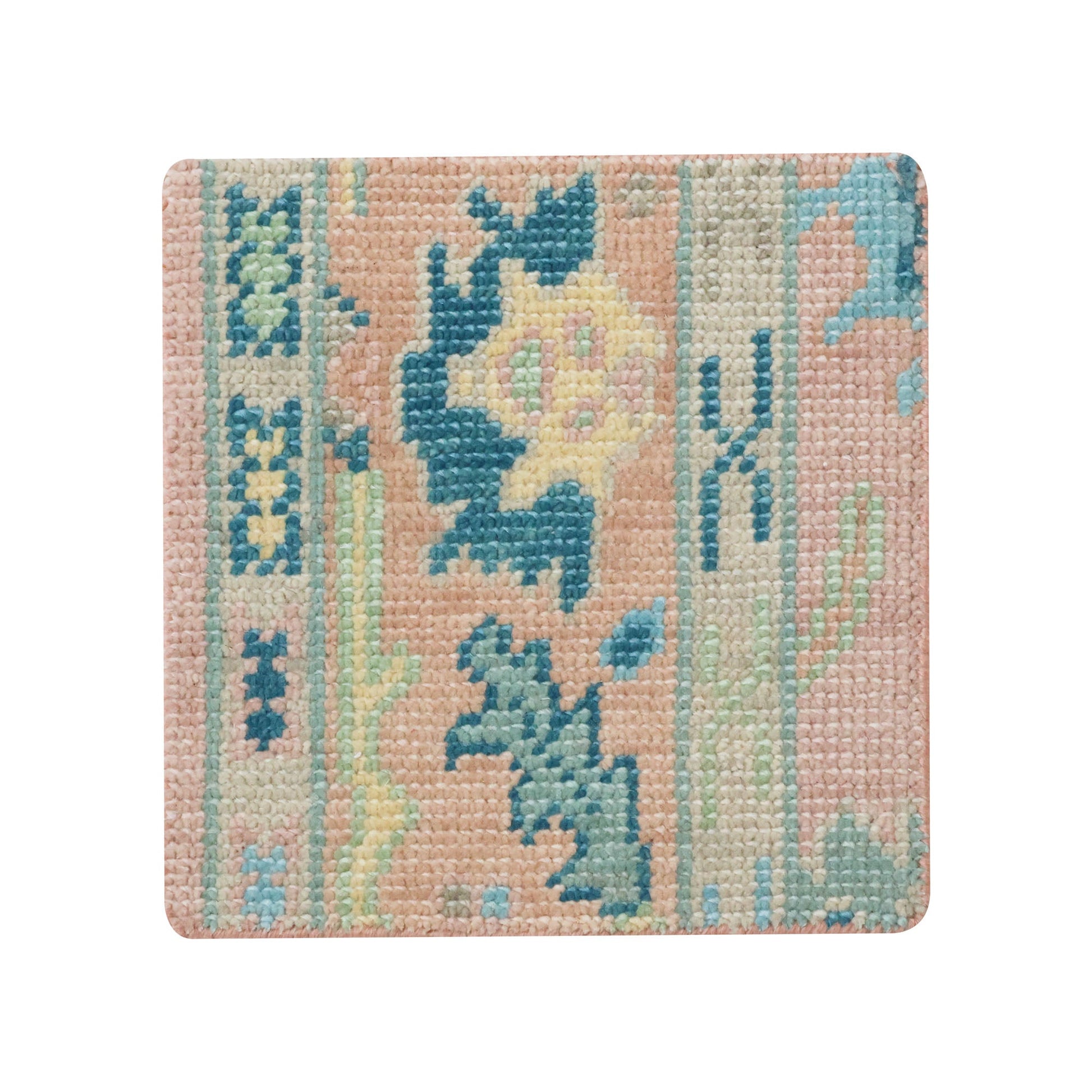 Hand-woven by artisans in India, our custom Stevie Rug features a modern take on a traditional oushak pattern with a light pink and blue colorway.