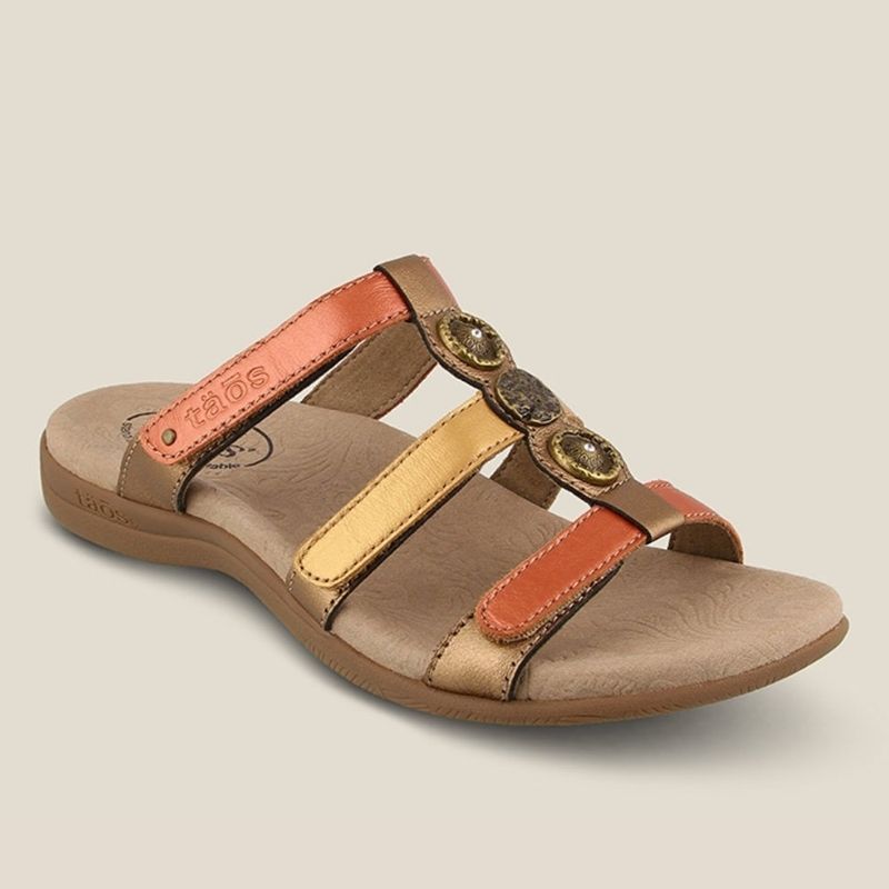 Prize 4 is a premium leather slide sandal with 3 bands of hook and loop straps offering complete adjustability. Pounded medallion hardware accent the multi-colored strappy upper offering a stylish, versatile look. Featuring an embossed microfiber footbed that is treated with an antimicrobial shield, keeping your feet cool and dry, with soft, cooling gel padding on top of polyurethane for maximum shock absorption. The outsoles are flexible, durable rubber.