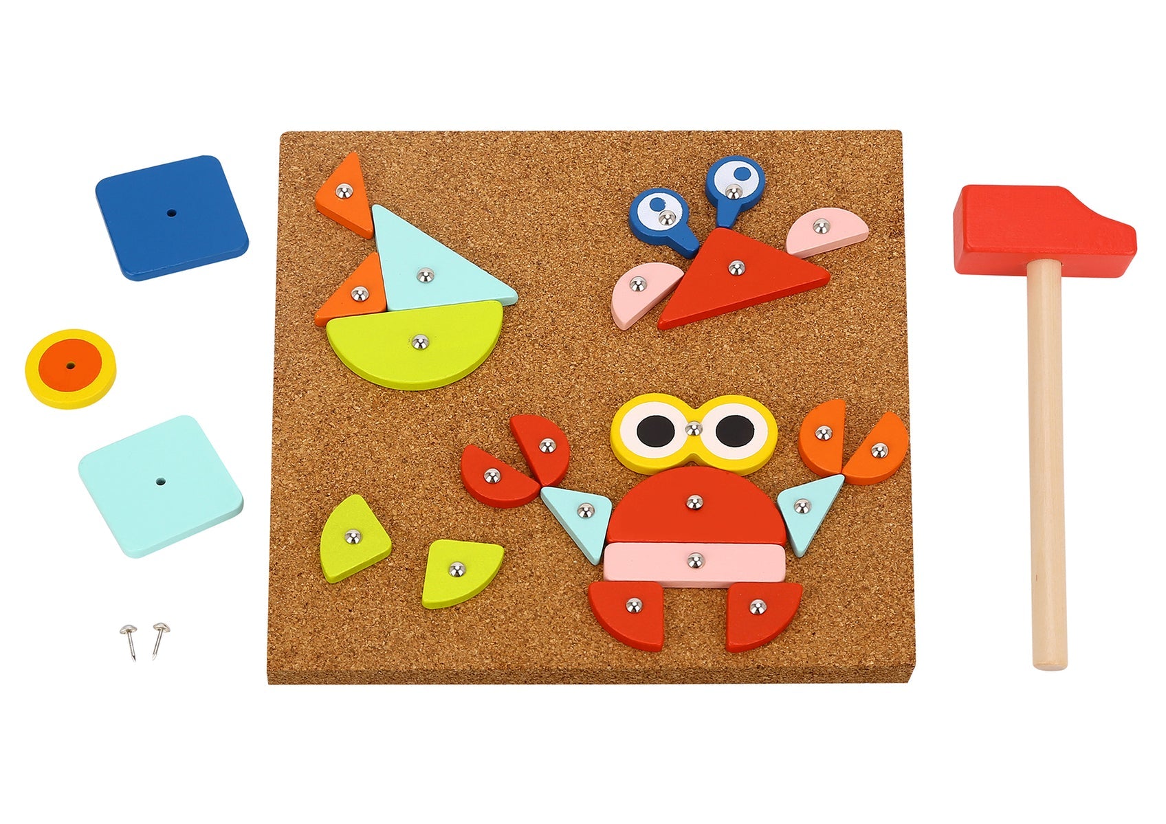 Classic building, construction and design set. Use the corkboard, hammer, tacks and wooden shapes to create colorful designs. Pattern cards to follow or create your own