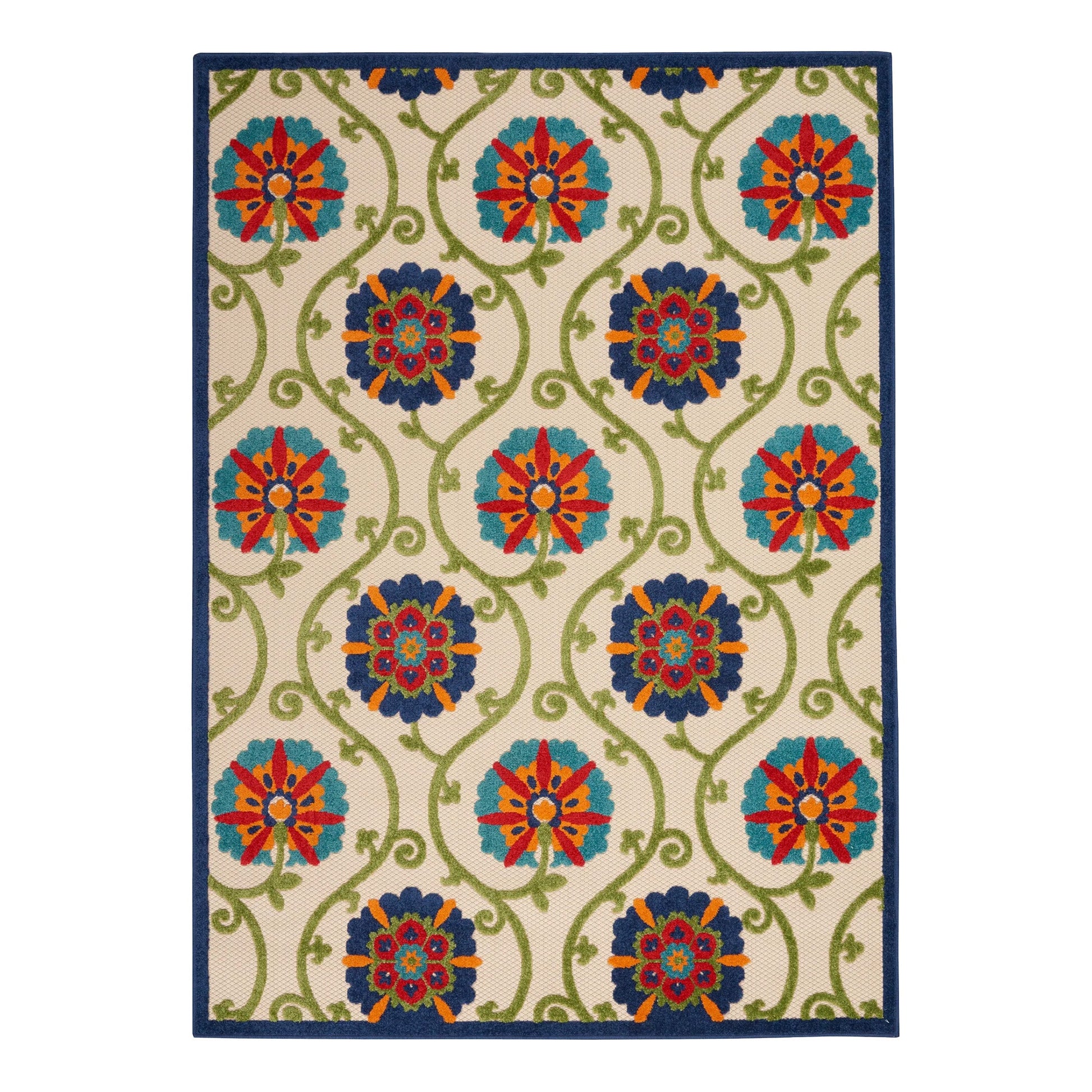 Contemporary and classic defines this collection of indoor/outdoor rugs. The flat weave, exciting colors and textures render these multipurpose rugs perfect for areas with high traffic and are easily cleaned. The happy Flower motif brings Springtime all year round to any living area. Material: 100% Polypropylene. Imported.