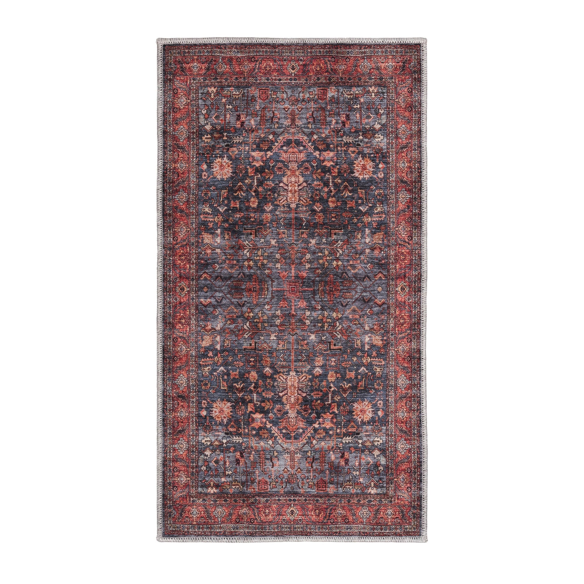 Bring practical sophistication to your living space with the machine washable Topanga Collection of floor coverings. Featuring a rich color palette of indigo and brick, a distressed and classic Persian motif brings timeless style to your space. Power loomed from durable poly fibers, these pieces are the ultimate in long wearing, easy-care. Soft under foot, a rug from this collection will add warmth and layer to your boho or traditional space. Completely machine washable, the Topanga Collection can go right into the washing machine for a refresh! What's not to love?