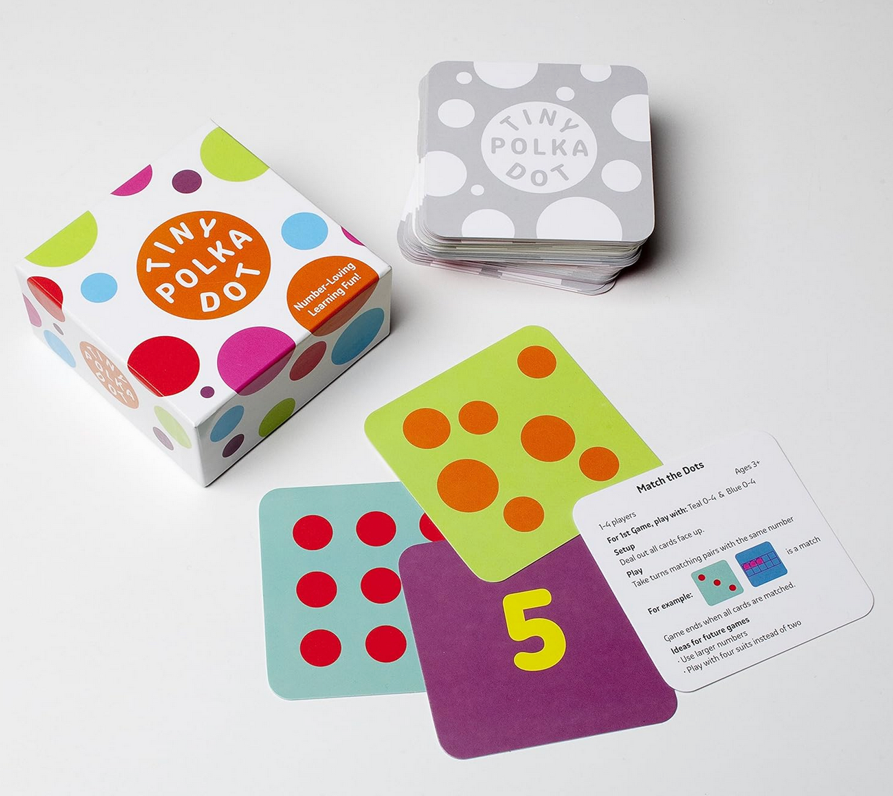 Tiny Polka Dot is the playful way for children ages 3 – 8 and up to fall in love with numbers. With eye-catching, colorful cards and 16 easy-to-learn games, Tiny Polka Dot is built to grow with your child, teaching critical skills in counting, arithmetic, and logic along the way.
