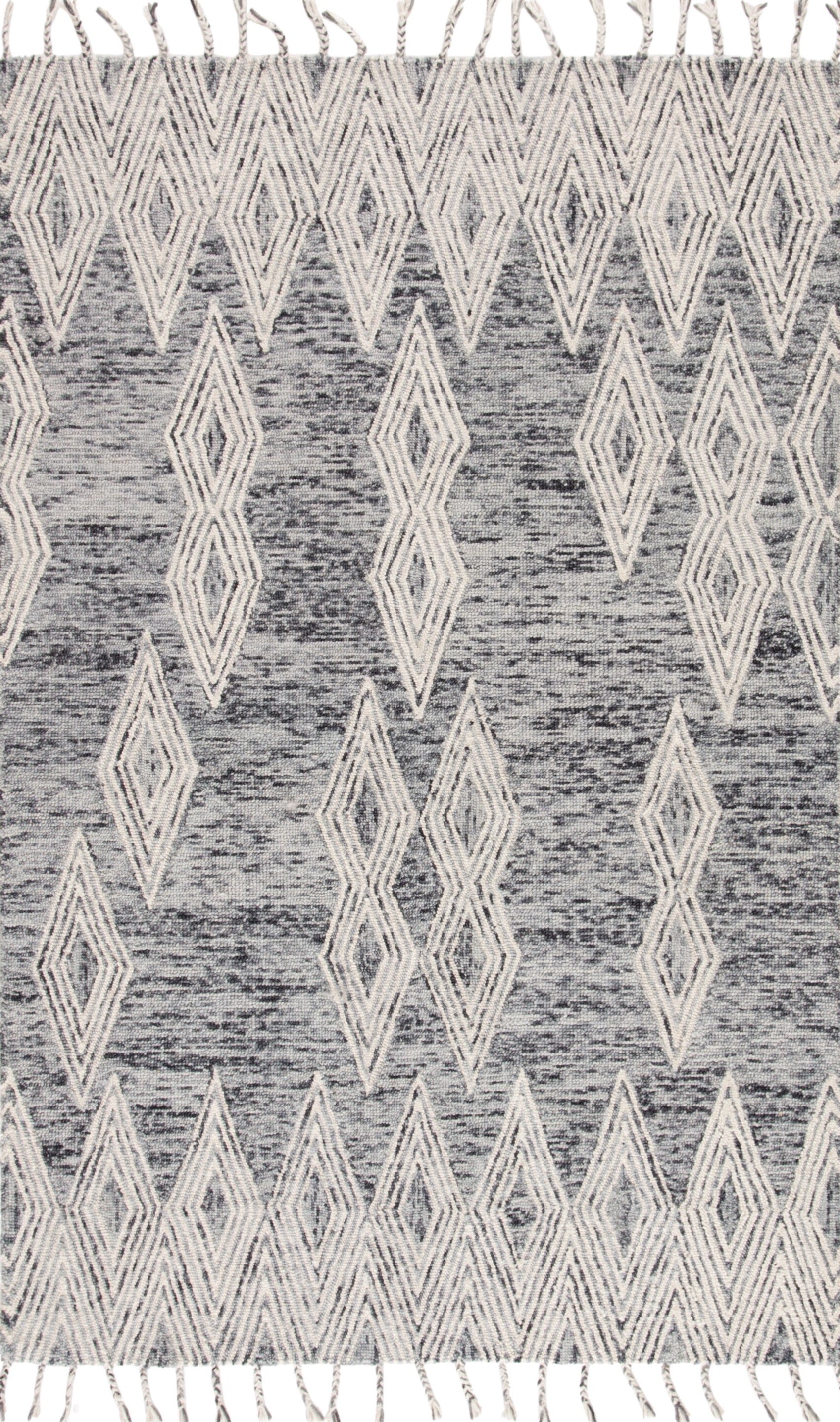 Hand tufted of wool, the Vera collection by Nikki Chu infuses contemporary spaces with inspiring patterns and versatile colorways. The fun and eclectic Mulberry rug features an ivory Moroccan-inspired geometric design that covers the blue-gray backdrop with a space-dyed effect. Long, braided tassels add a touch of boho-chic charm to this worldly rug.
