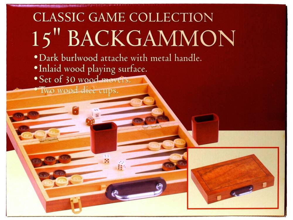 15" Dark Burlwood Attache. Features inlaid wood playing surface with wood movers & dice cups, and metal handle